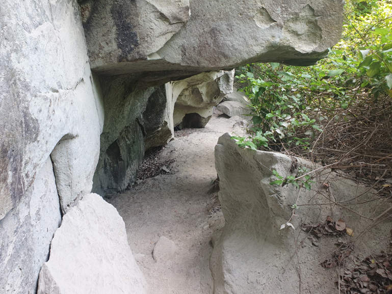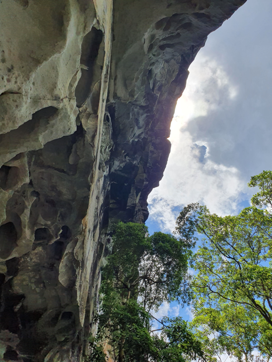 About 60% of the way up, I reached a section where the cliff face gave way to full-sized trees and dense foliage. The trail continued steeply up, but more like a jungle path in contrast to the open cliff face below it. Not much further and I emerged at the base of a second cliff face; this one sheer, the white rock walls rose up and overhead, jutting out and over the higher they got, the erosion of millions of years carving out the base of them. Large boulders dotted the area; no doubt once belonging to sections of the cliff further up. Underfoot the fine white rock dust created the felling of walking on sand, an odd sensation knowing we were a fair way from the coastline, and I had just climbed 200m or so up a cliff face. It was a magical and spiritual place, cool from the shade afforded by the cliffs and the trees, and spectacular with the over-arching cliffs and the hollowed shapes carved into the rock from wind and water and time.